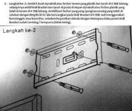 Setelah anda memastikannya, silahkan tandai dengan pensil 4 lubang di dinding untuk dibor ( pemasangan braket), Gunakanlah piringan braket dan bantuan waterprass untuk menenadai dinding supaya dalam pengeboran tidak miring.